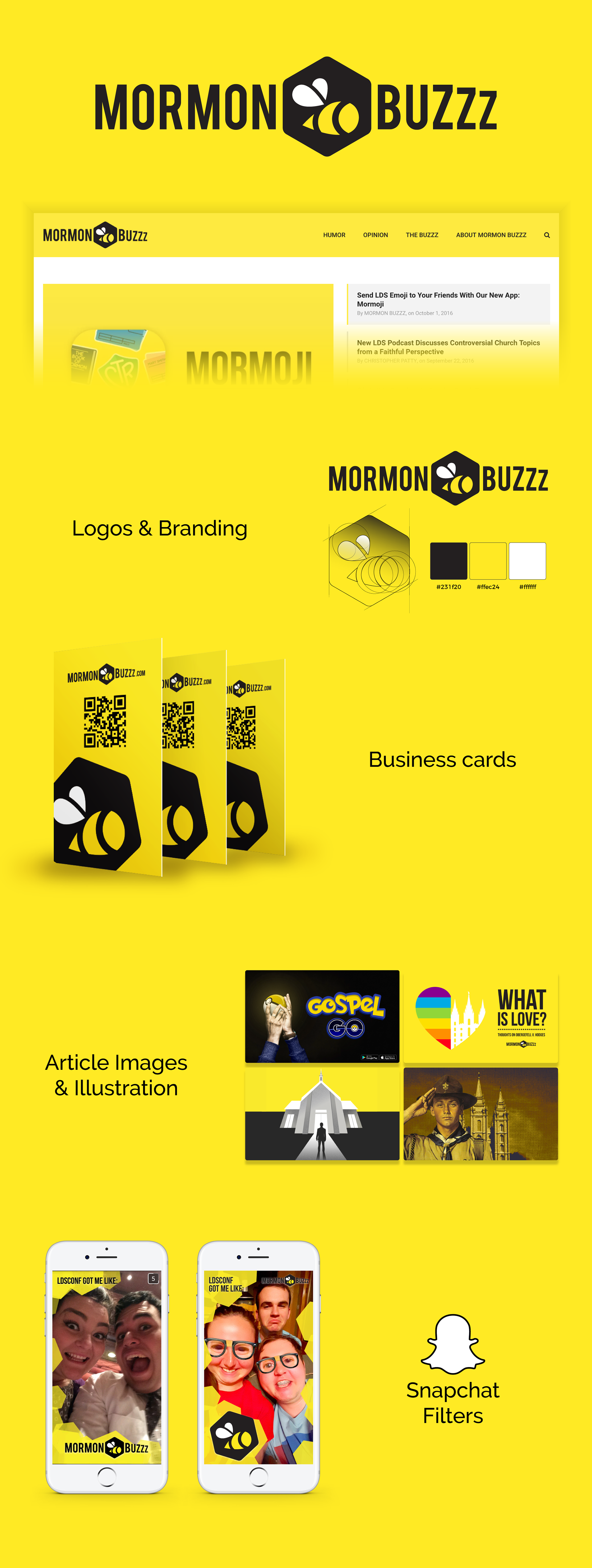 Since spring of 2015 I've designed banding, logos, marketing materials, article images, and more for "Mormon Buzzz", a self-owned online publication.